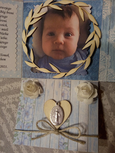Trochę nerwów mnie ten drobiazg kosztował tym bardziej, że nie miałam oprócz krzyżyka ofiarowanego przez pewną Dobrą Duszyczkę, żadnych przydasi związanych z chrztem. Grafiki znalazłam na Pinterescie a reszta to improwizacja. Szatkę wycinałam z kartonu sama bo nie mam szablonu.